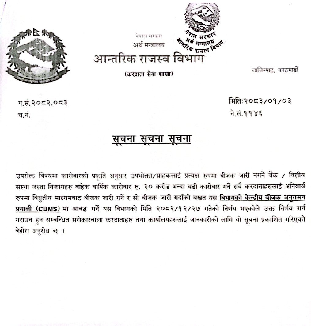 कारोबारको प्रकृति अनुसार उपभोक्ता/ग्राहकलाई प्रत्यक्ष रूपमा बीजक जारी नगर्ने बैंक/वित्तीय संस्था जस्ता निकायहरू बाहेक वार्षिक कारोबार रु. २० करोडभन्दा बढी गर्ने सबै करदाताहरूले अनिवार्य रूपमा विद्युतीय माध्यमबाट बीजक जारी गर्ने र सो बीजक जारी गर्दाकै बखत यस विभागको केन्द्रीय बीजक अनुगमन प्रणाली (CBMS) मा आबद्ध गर्ने यस विभागको मिति २०८२/१२/२७ गतेको निर्णय भएकाले, उक्त निर्णय कार्यान्वयन गर्न/गराउन सम्बन्धित सरोकारवाला करदाता तथा कार्यालयहरूको जानकारीका लागि यो सूचना प्रकाशित गरिएको वेहोरा अनुरोध छ।